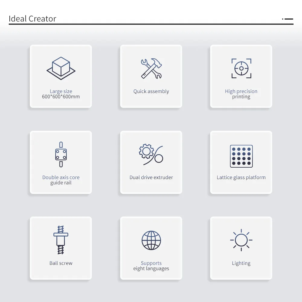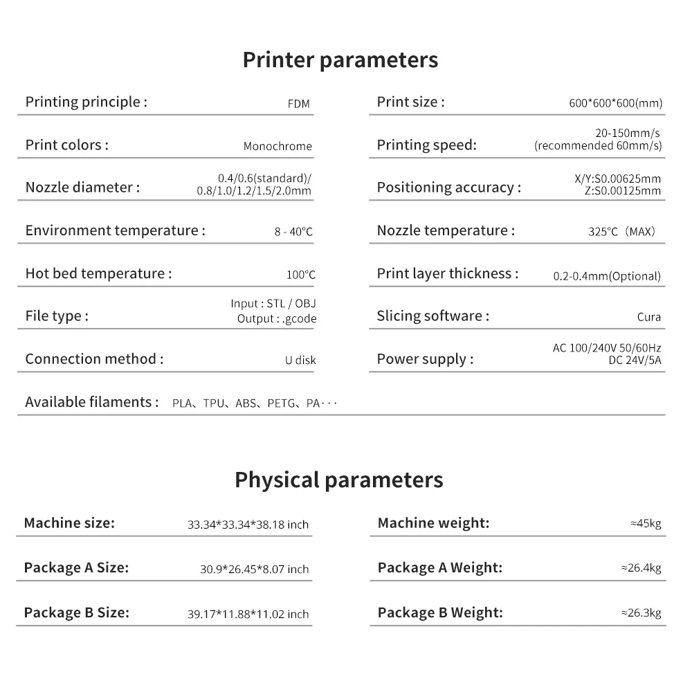 Suurikokoinen FDM-tulostin, joka yhdistää 600*600*600(mm) tulostuskoon, tarkan mekaniikan ja monipuolisen materiaalituen tehokkaaseen prototypointiin ja suurten osien valmistukseen.