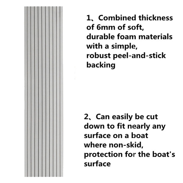 Liukastumista estävä EVA-vaahtolevy tuo teak-puun ilmeen ilman puun asennuksen, kustannusten ja huollon vaivaa. Pehmeä ja kestävä pinta lisää mukavuutta ja pitoa myös märkänä, ja tukeva irrota-ja-kiinnitä-taustaliima helpottaa asennusta. Levy voidaan leikata sopimaan useimmille veneen pinnoille, joissa tarvitaan pitoa tai suojaa.