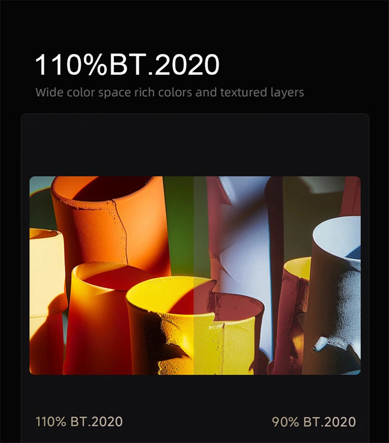 Väriavaruus: 110% BT.2020 laajalle väriavaruudelle ja rikkaalle tekstuurille