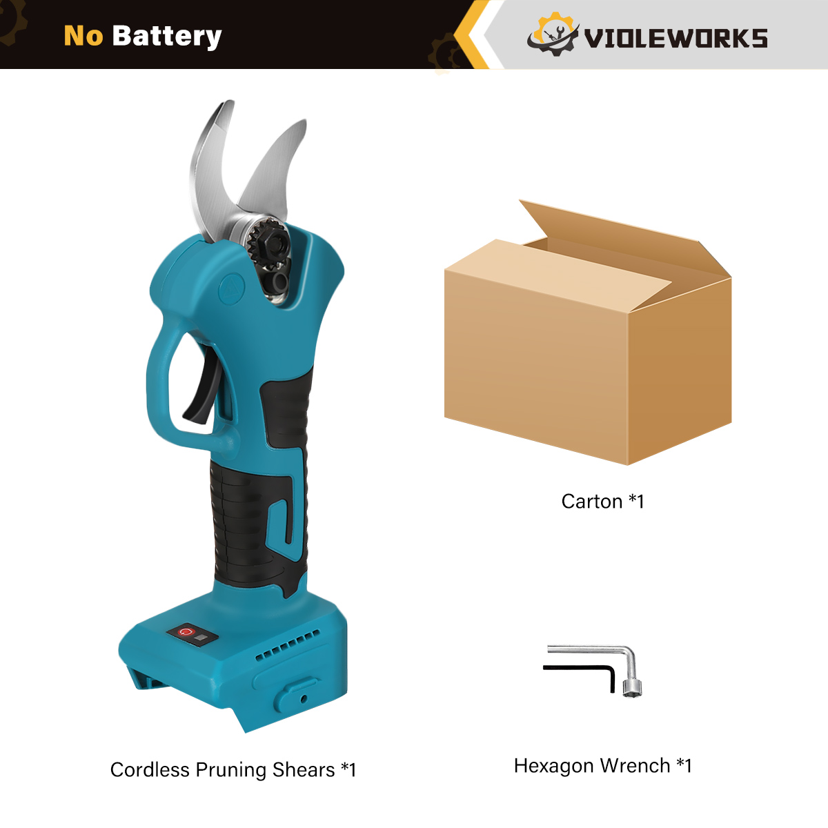 VIOLEWORKS 21V Brushless Pruning Shears toimitetaan CE-merkityssä pahvipakkauksessa, mikä kertoo tuotteen täyttävän korkeat turvallisuus- ja laatuvaatimukset. Vankka rakenne ja tasainen suorituskyky takaavat luotettavan käytön kerta toisensa jälkeen.