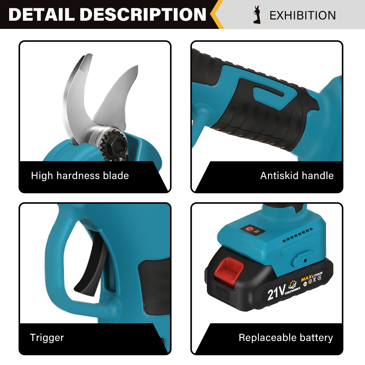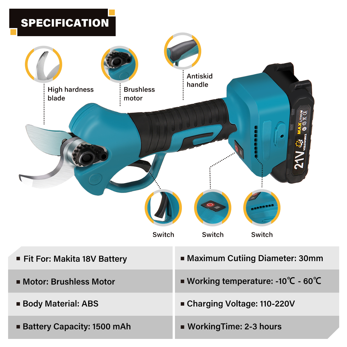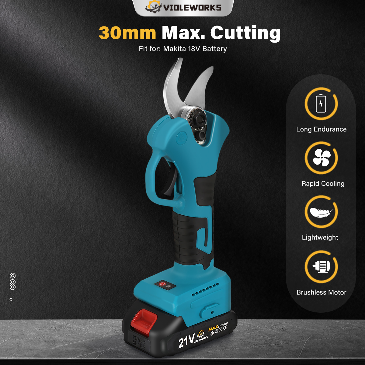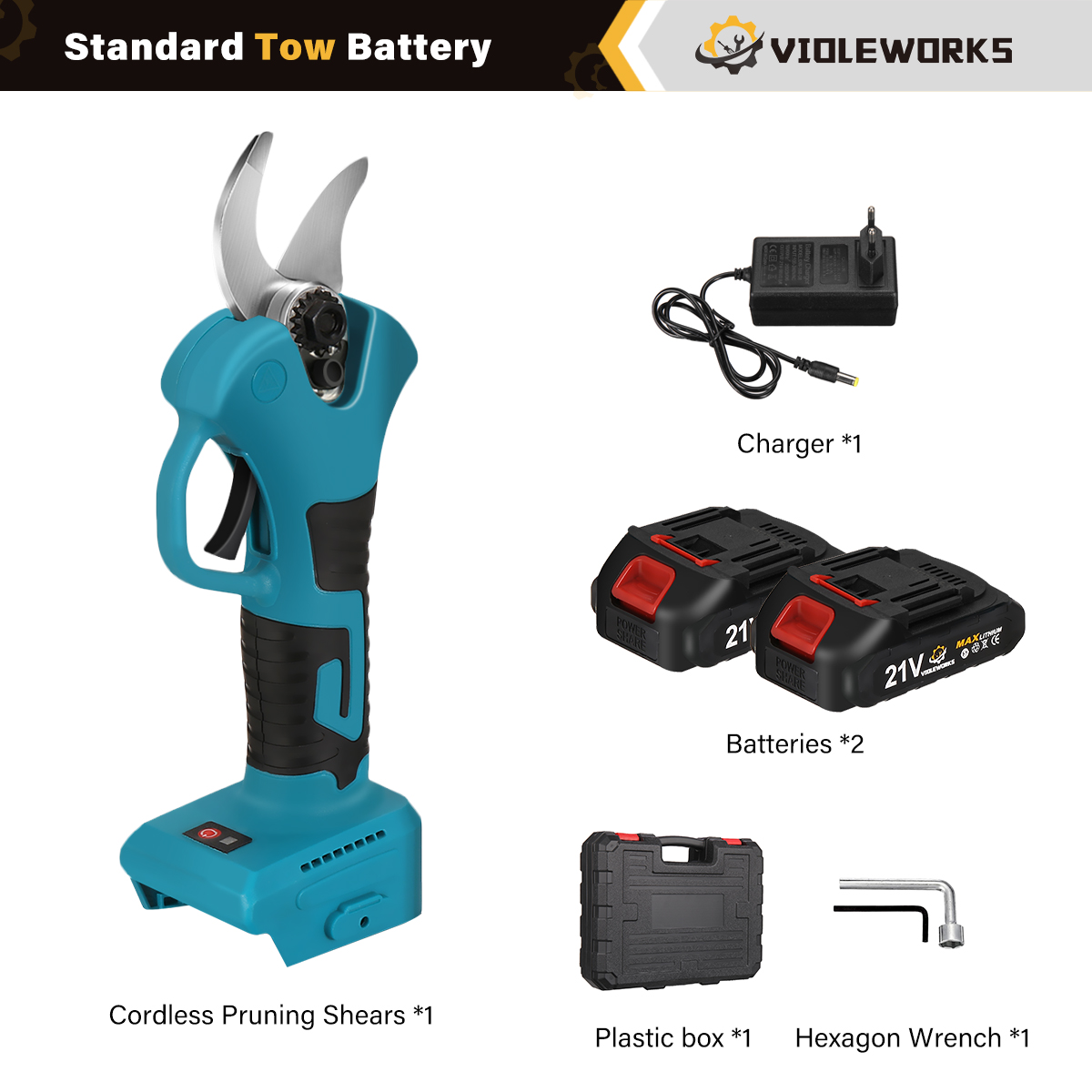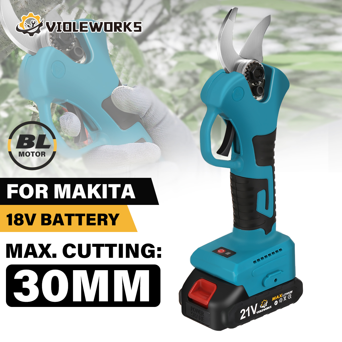 VIOLEWORKS 21V oksasakset 1500mAh akku laturi harjaton moottori ergonominen