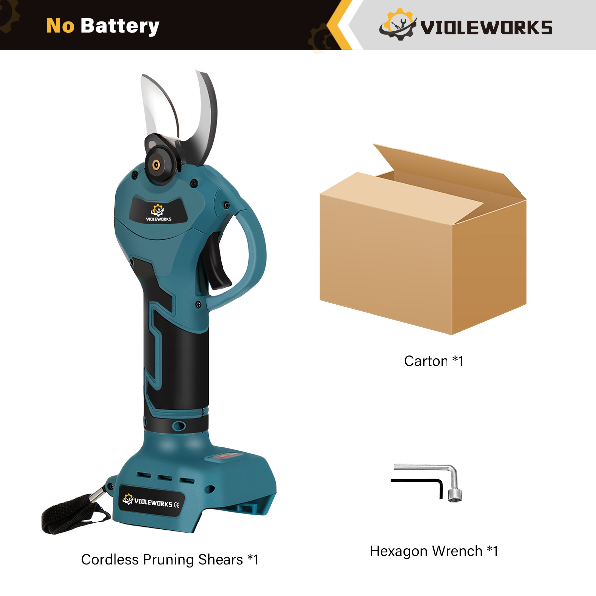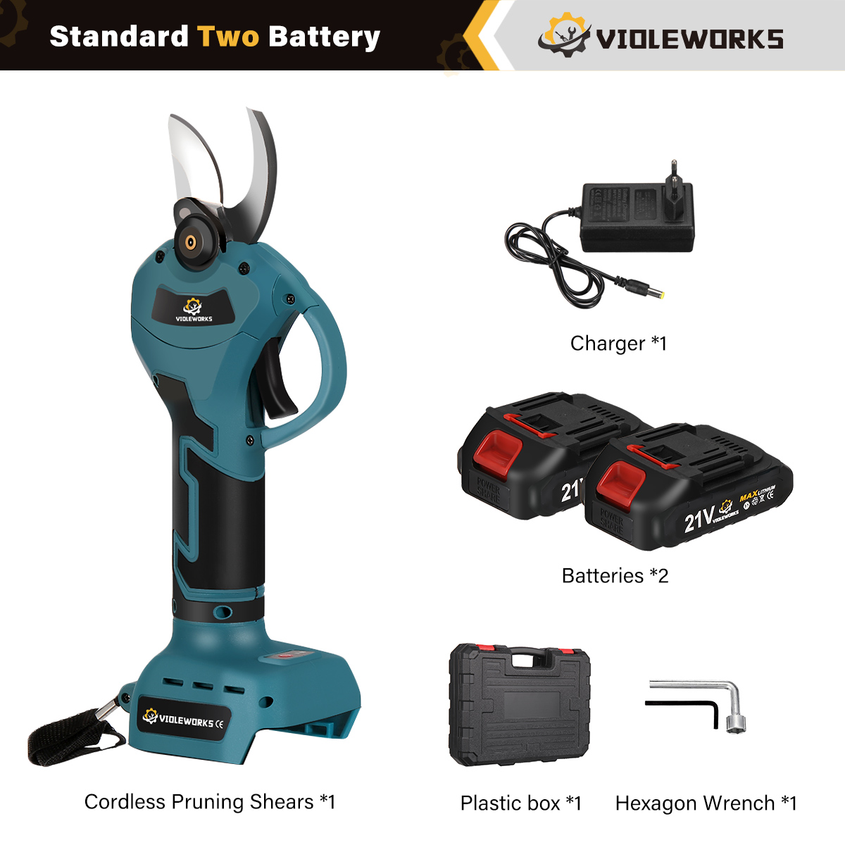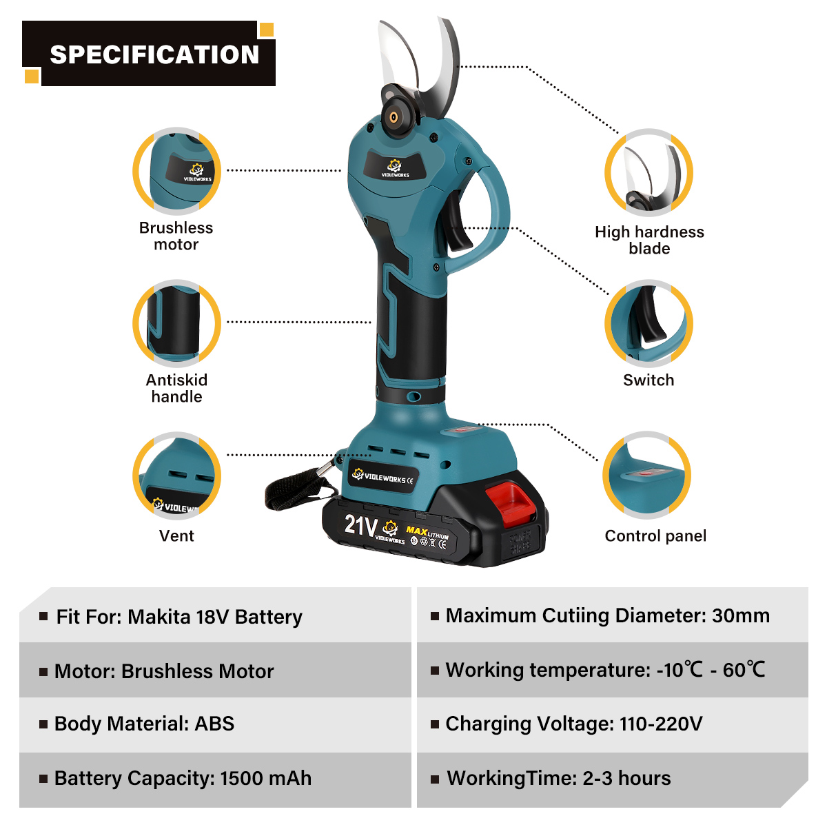 VIOLEWORKS 21V oksasakset 1500mAh akku harjaton moottori laturi sininen musta kotelo 30 mm aukko