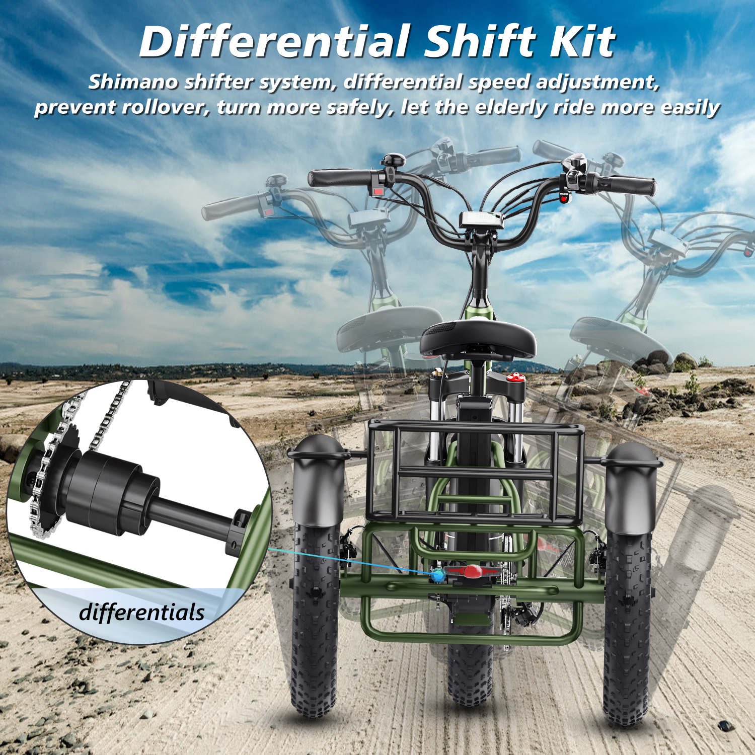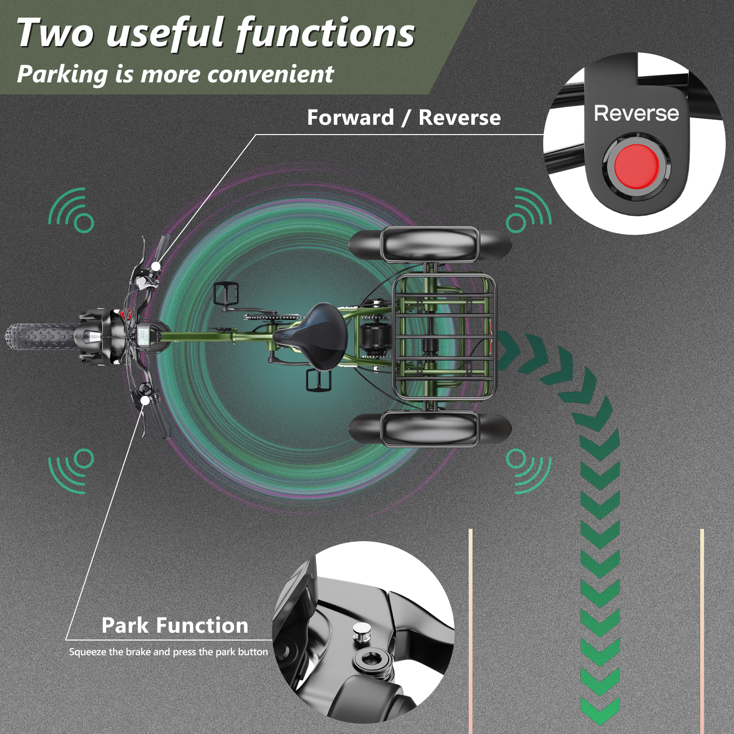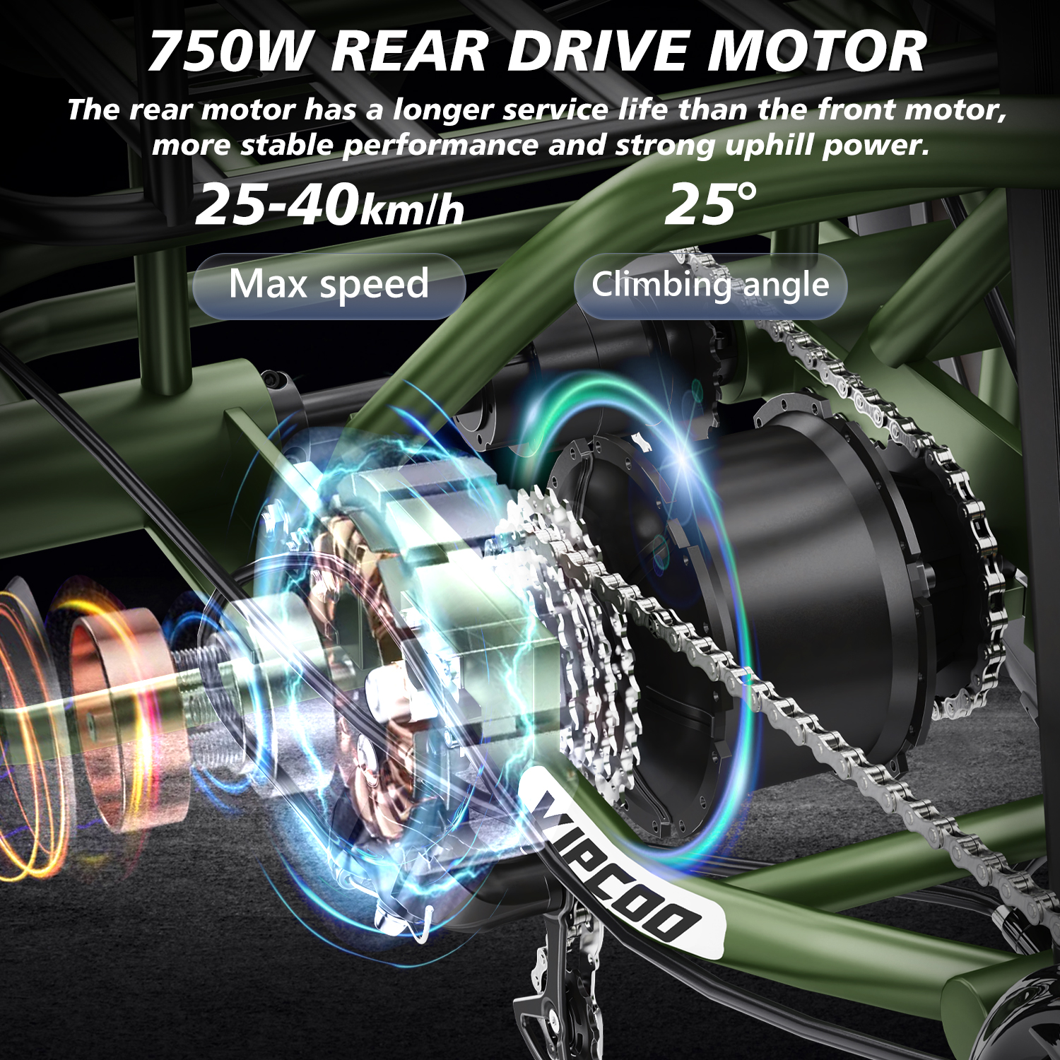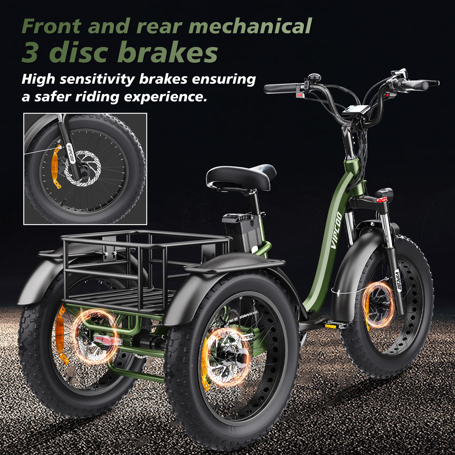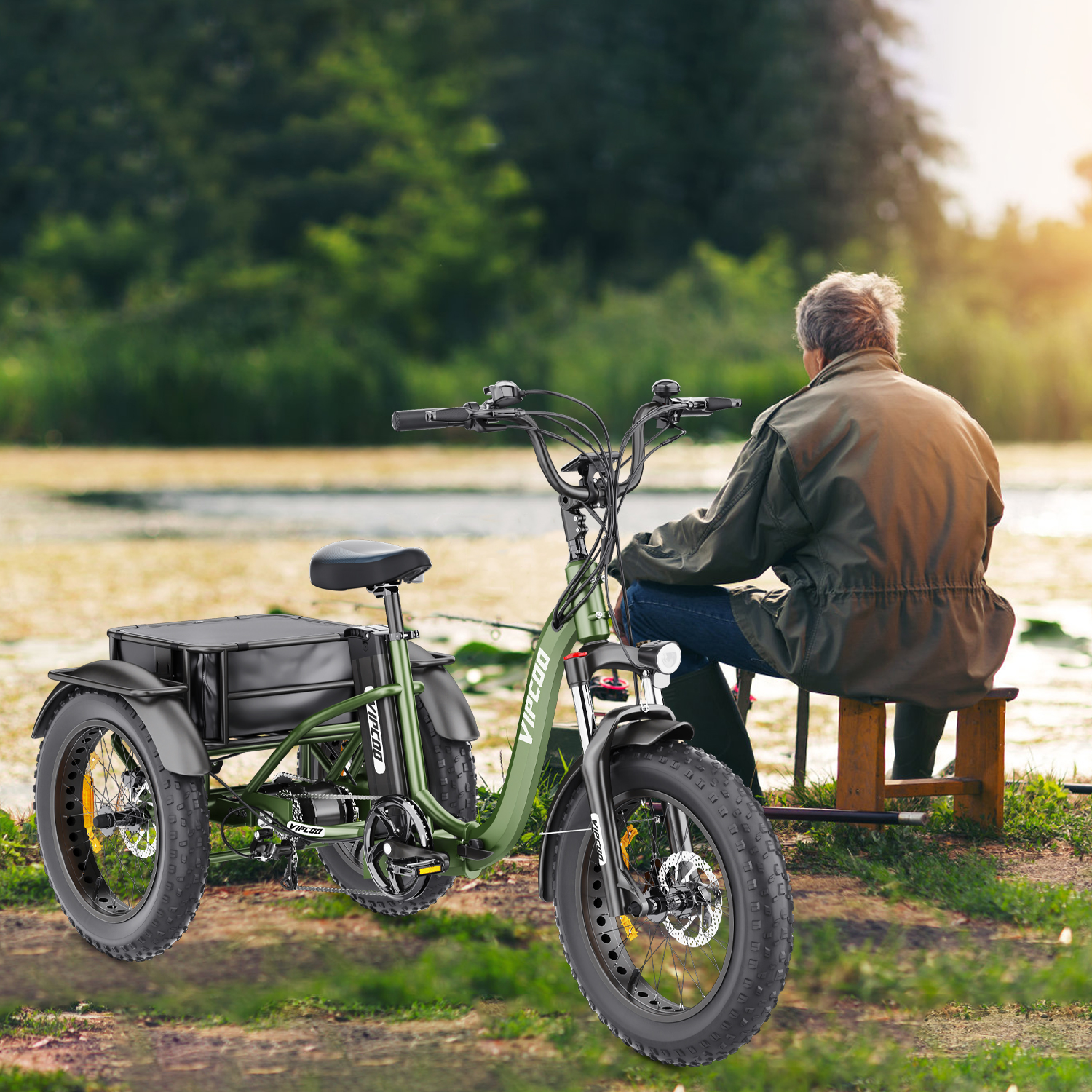 VIPCOO VC-ET1 on kolmipyöräinen sähköpyörä, joka yhdistää vakaan ajotuntuman, tehokkaan 750W moottorin ja suuren 48V 20Ah irrotettavan akun. Leveät 20*4.0 -tuumaiset maastokäyttöön soveltuvat ilmakumirenkaat ja etuhaarukan jousitus parantavat ajomukavuutta sekä kaupungissa että soratiellä. Kolme etu- ja takalevyjarrua sekä valaistusjärjestelmä lisäävät ajoturvallisuutta.