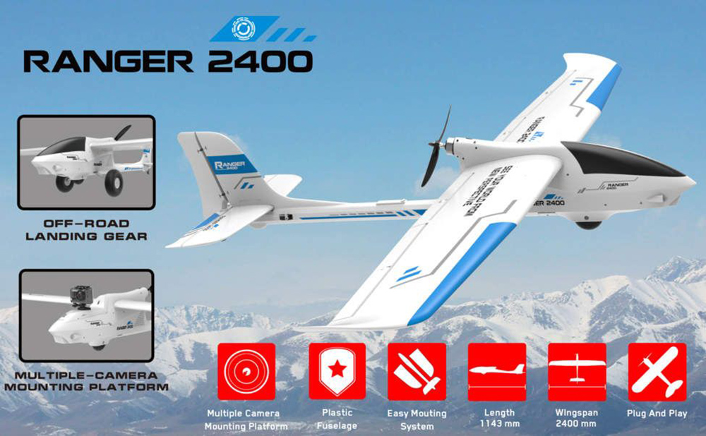 Ranger2400 on suuri, vakaa ja helposti lennätettävä liidokkimalli, joka on suunniteltu kantamaan raskaita akkuja ja lentämään pitkiä lentoja. Muovinen runko tarjoaa hyvin tilaa elektroniikalle ja akuille, ja 5-kanavainen ohjaus antaa mahdollisuuden monipuolisiin lento-ominaisuuksiin laskusiivekkeillä.