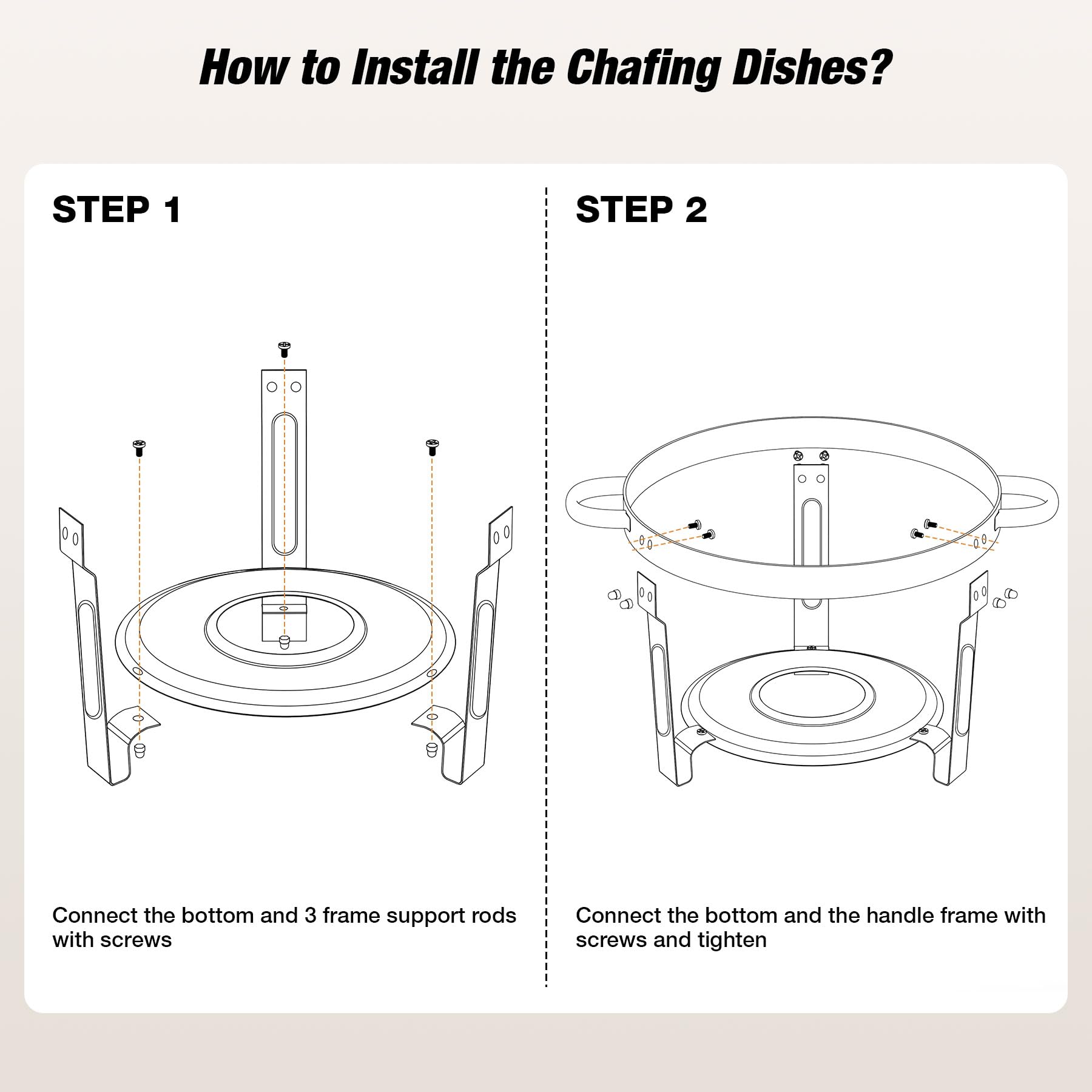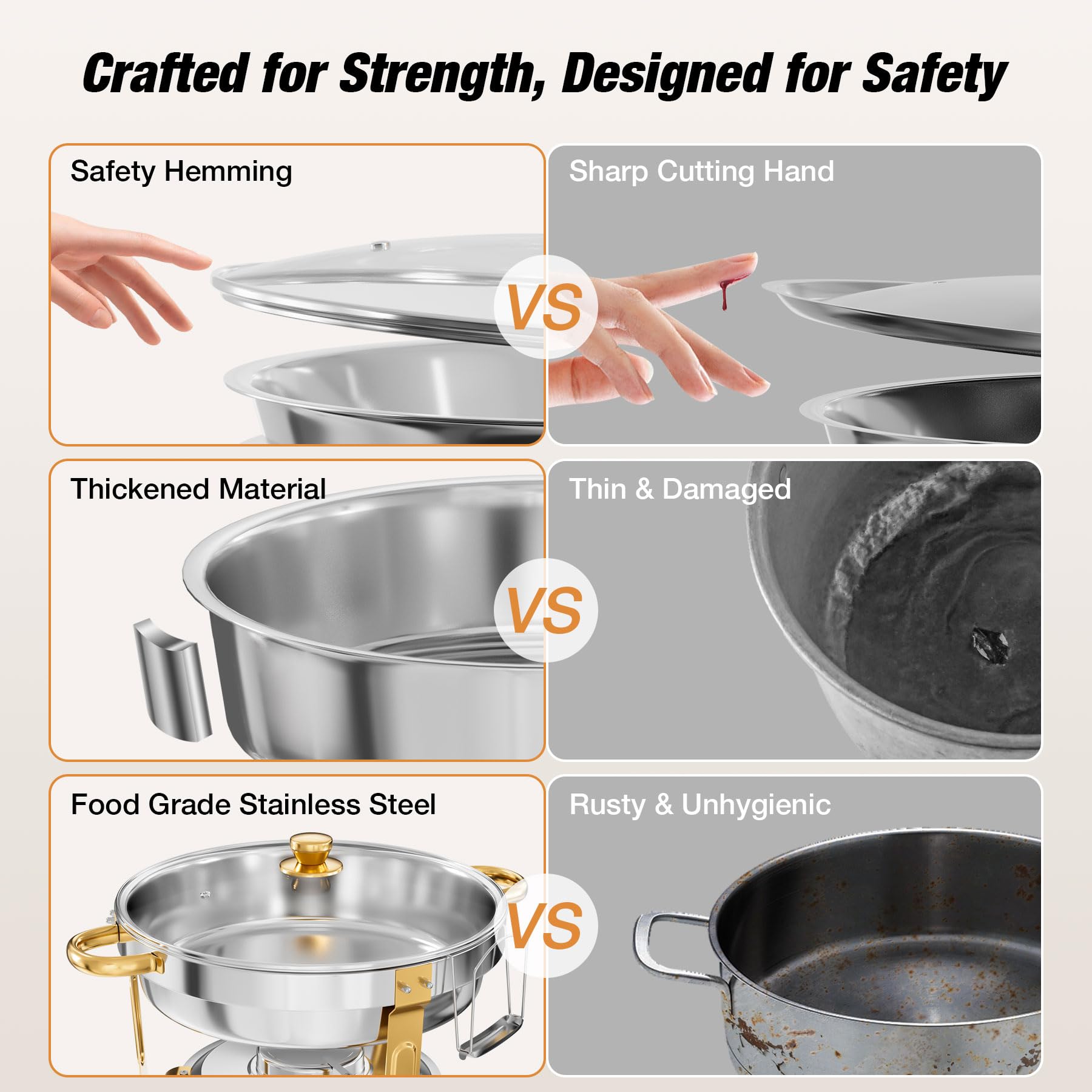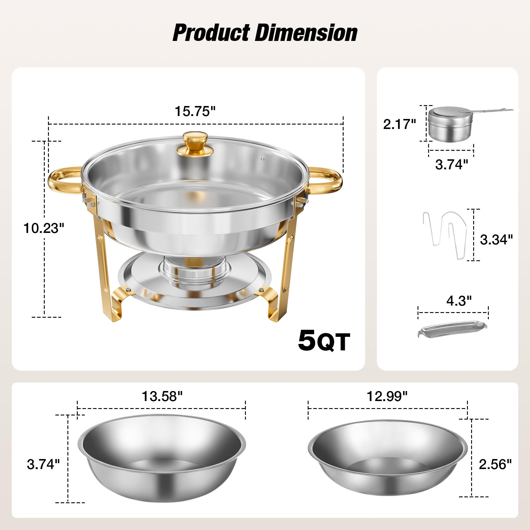 Suuri 5QT-tilavuus riittää tarjoiluun noin 5 tai useammalle vieraalle per astia, mikä tekee lämpöhauteista sopivan valinnan juhliin, häihin, buffetteihin ja pitopalvelukäyttöön. Pinottava jalusta, vesiallas ja ruoka-astia helpottavat säilytystä ja voivat vapauttaa jopa 50 % tilaa käytön jälkeen.