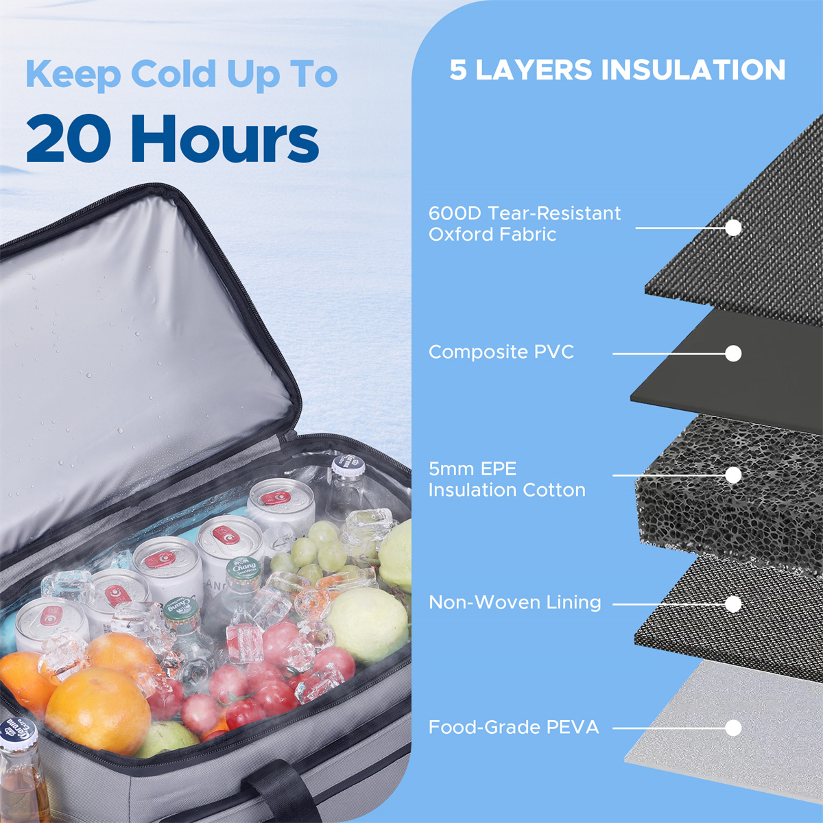 Kylmälaukku on valmistettu 5-kerroksisesta eristyksestä, joka auttaa säilyttämään jään ja viileyden jopa 20 tunnin ajan. Juomat pysyvät raikkaina myös kuumissa ulko-olosuhteissa.
