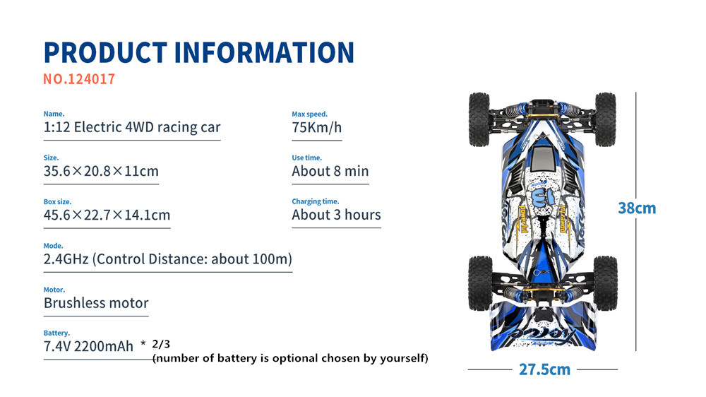Merkki: Wltoys Tuotenro: 124017 Skaala: 1/12 Väri: sininen Huippunopeus: 70 KM/H |