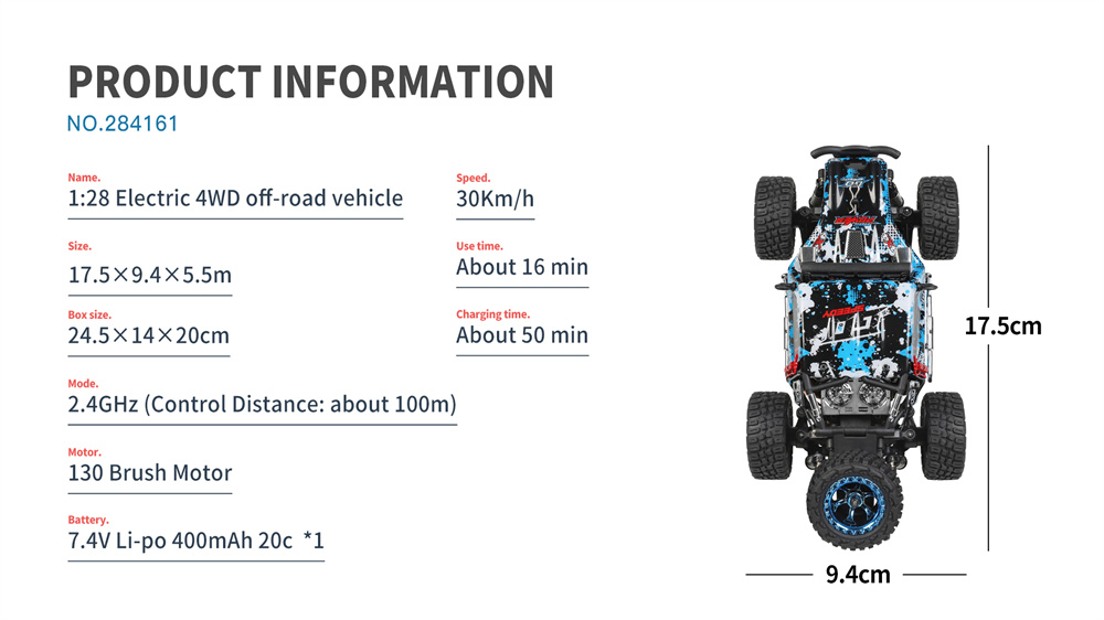 | Perustiedot | Tuotemerkki: Wltoys Tuotenro: 284161 Mittakaava: 1/28 Väri: sininen Suurin nopeus: 30km/h |