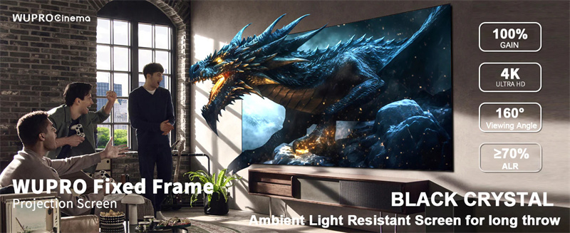 Wupro Cinema Gallery LT2 Fixed Frame Black Crystal Screen on kiinteäkehuksinen seinäkiinnitteinen valkokangas, joka soveltuu olohuoneeseen ja kotiteatteriin. Se hylkii tehokkaasti ympäröivää valoa ja säilyttää kuvan tasalaatuisena laajasta katselukulmasta.