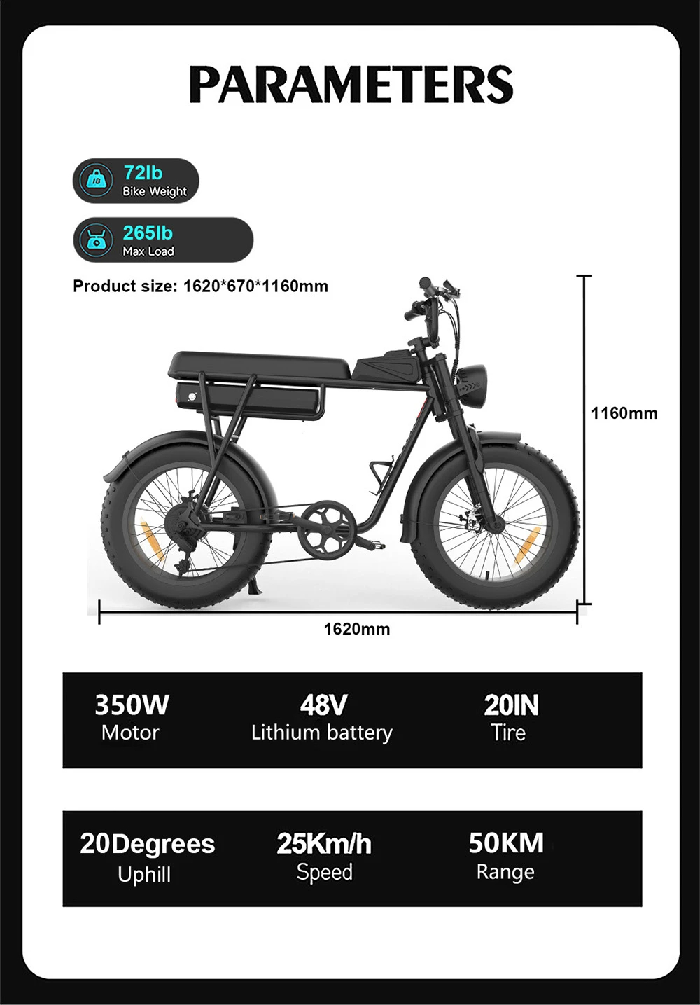 YAMALI FXH-006 on sähköpyörä, jossa on tukevat 20*4.0-tuumaiset leveät renkaat, mekaaniset levyjarrut edessä ja takana sekä SHIMAN0 7-vaihteinen vaihteisto. 48V 350W -moottori ja 48V 18AH Dongci -akku tarjoavat enintään 50KM/H huippunopeuden ja noin 45–50KM toimintasäteen yhdellä latauksella.