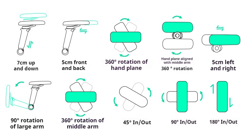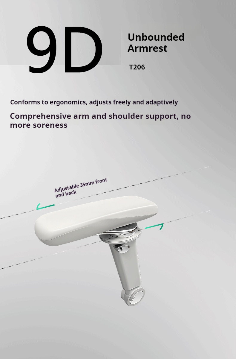 2. 9D-käsinojien säädettävyys: säädettävissä ylös, alas, vasemmalle, oikealle sekä kiertoon, ergonominen muotoilu.