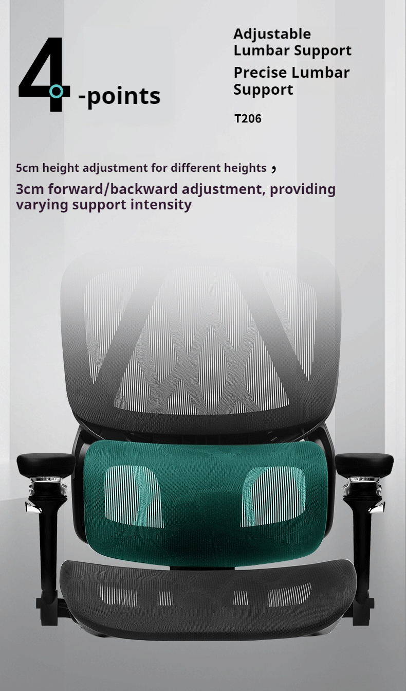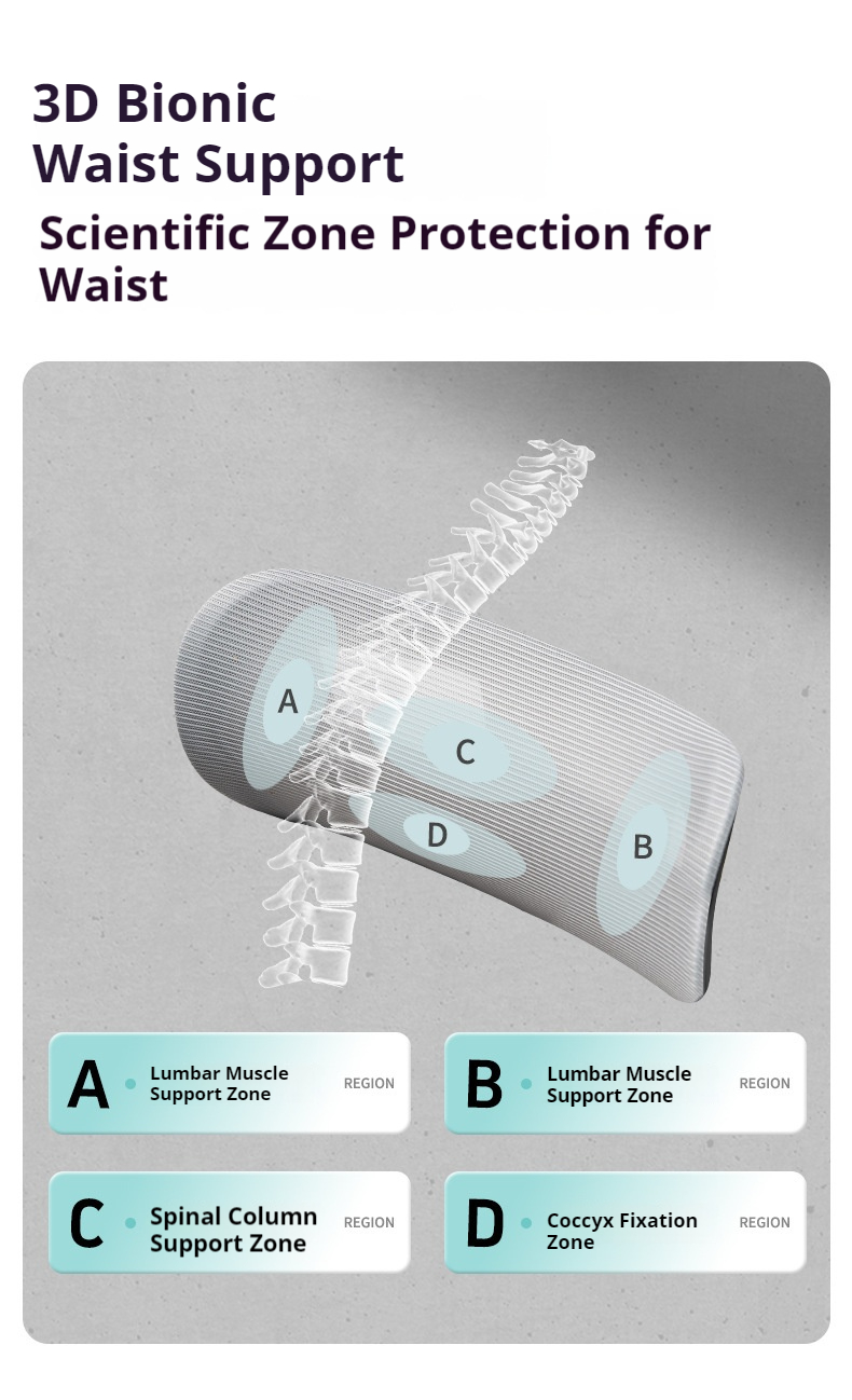 1. Monisuuntainen lannerangan tuen säätö: tarjoaa tarkan tuen selän eri alueille (lannelihakset, nikamatuki ja häntäluu).