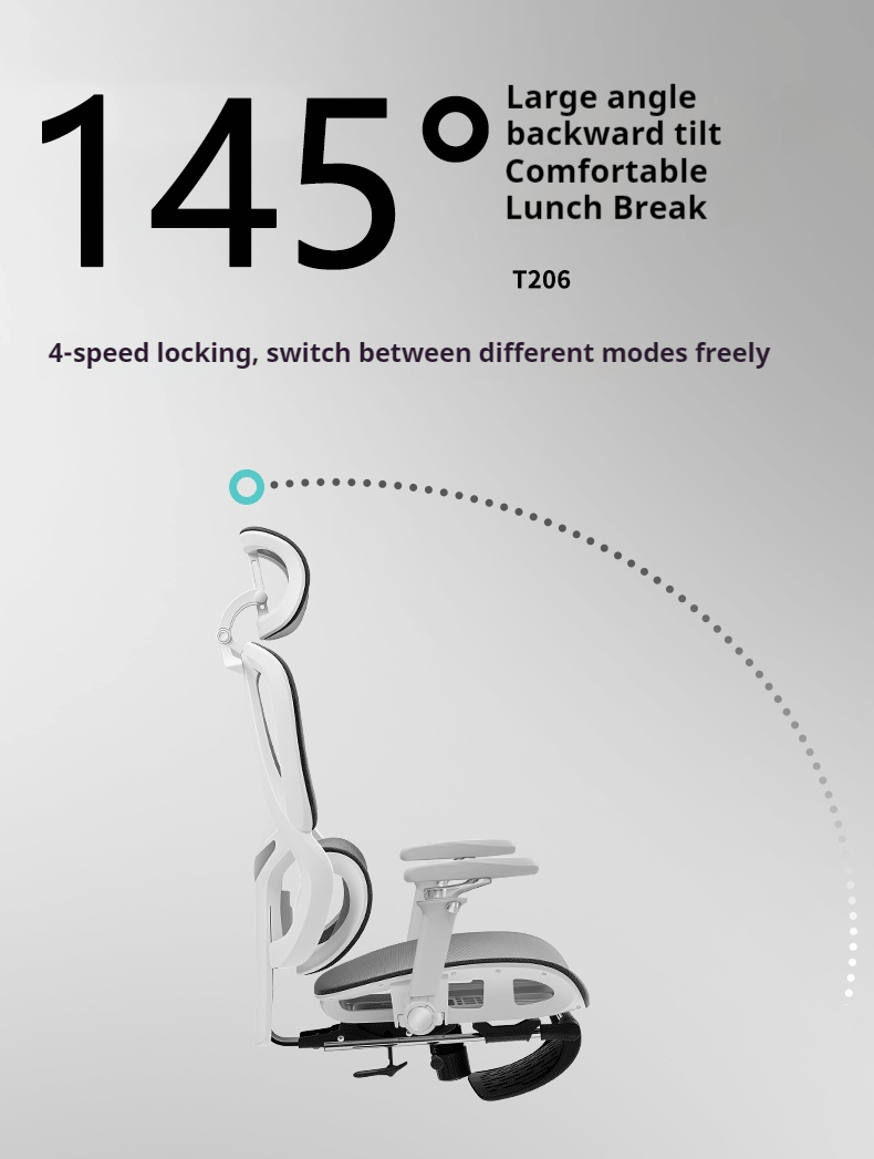 4. 145° kallistuva selkänoja: neljä lukitusasentoa sujuvaan siirtymään istumis-, rentoutumis- ja makuuasentojen välillä.