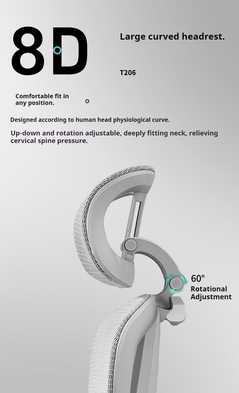 5. 8D-niskatuki: korkeuden ja käännön säätö, joka mukautuu pään muotoon ja tukee niskaa.