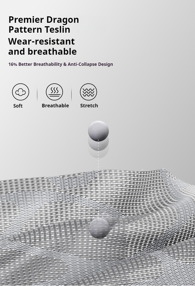 3. Hengittävä verkkorakenne: lohikäärmekuvioitu Teslin-verkko parantaa ilmanvaihtoa ja ehkäisee muodonmuutoksia.