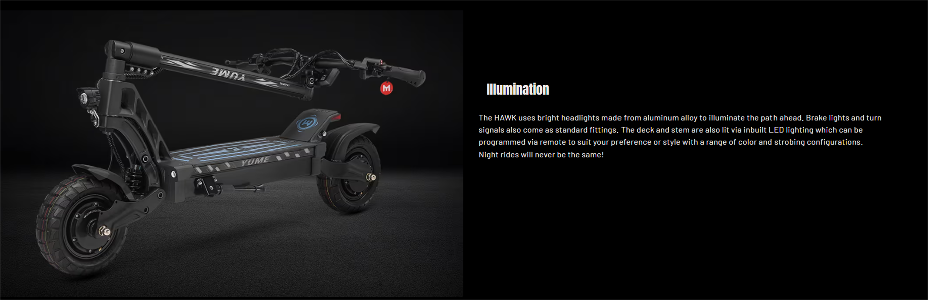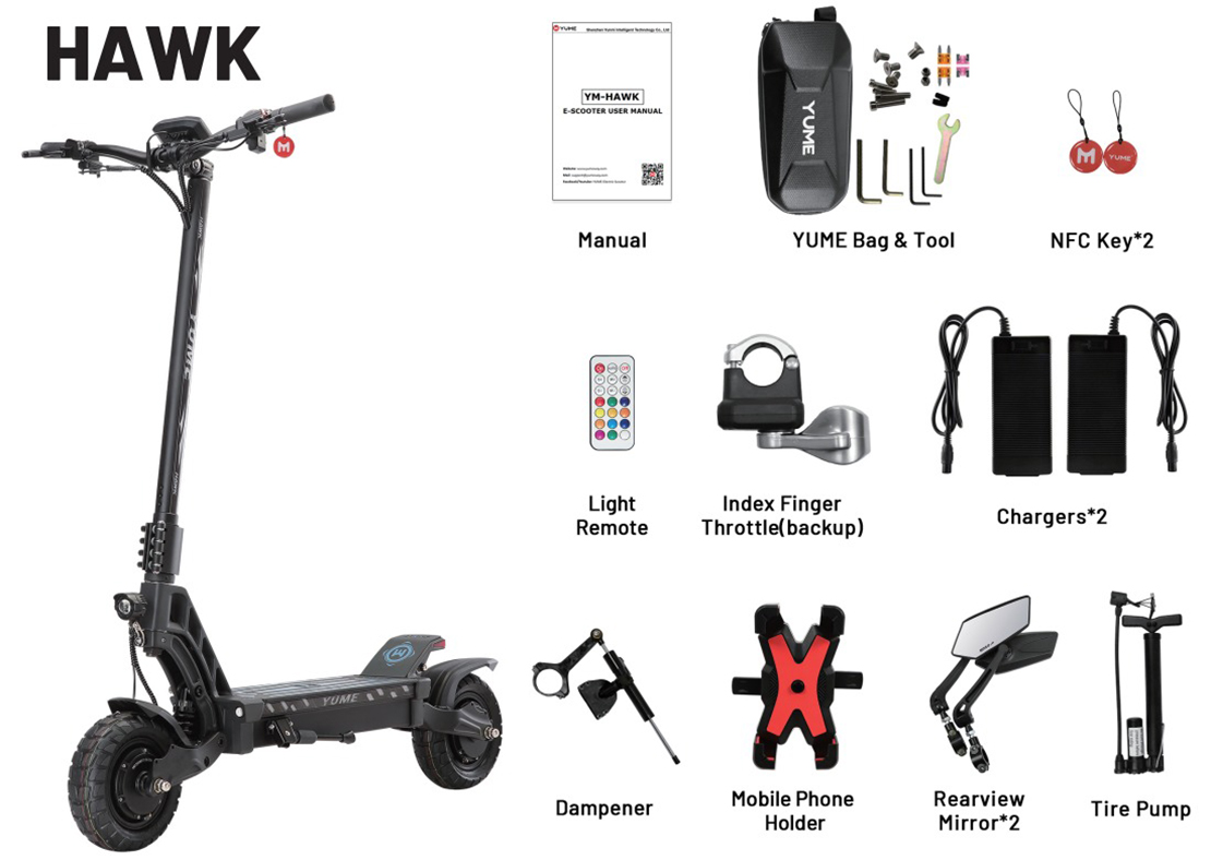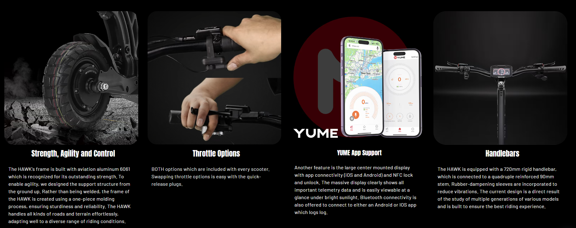 YUME HAWK on tehokas sähköpotkulauta, joka on suunniteltu mukavaan ja vakaaseen ajoon sekä kaupunkikaduille että vaihteleville alustoille. Kaksi 60V 1200W -moottoria, pitkä toimintamatka ja säädettävä jousitus tekevät siitä sopivan sekä päivittäisiin matkoihin että pidempiin ajoihin.