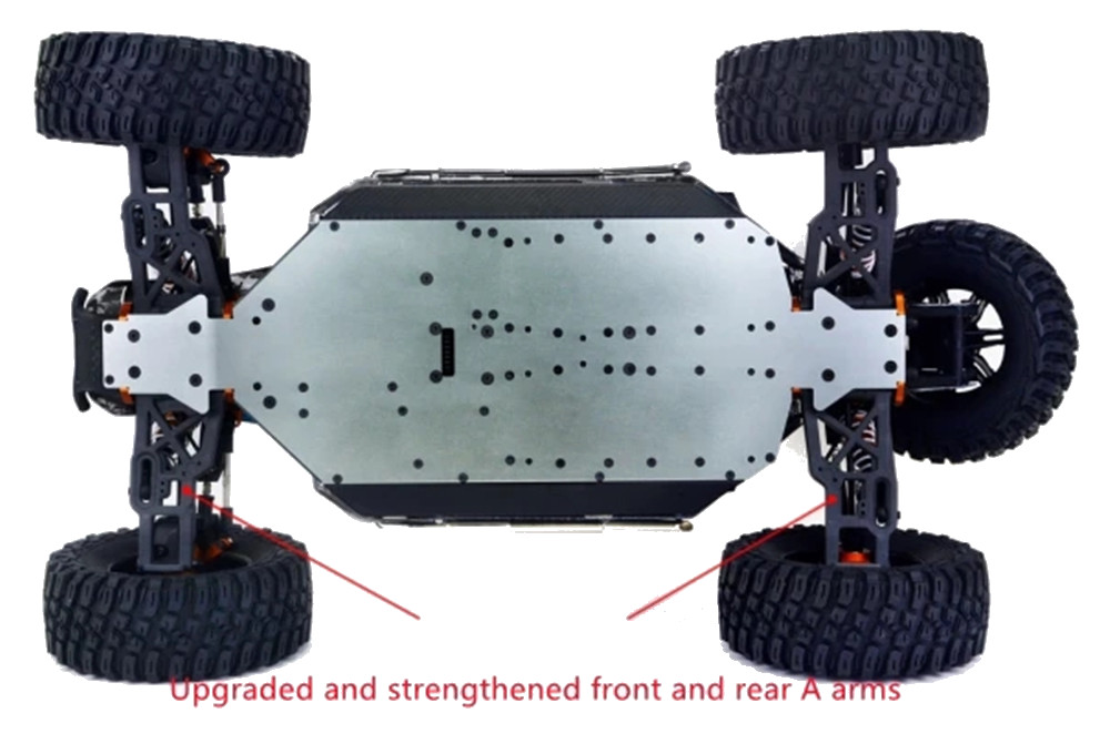 6. Tehokas voimansiirtojärjestelmä: DBX-07 käyttää suurempaa moduulia ja kookkaampia tasauspyörästöjä, täysin metallista keskitettyä tasauspyörästöä, CNC-käsiteltyjä kromimolybdeeniteräksisiä rataspyöriä, tuontiteräksisiä koirapukkapinnejä, vahvistettuja vetoakseleita ja suurikapasiteettisia iskunvaimentimia. Vaihdelaatikossa on ruiskuvalettu ja metallisella laakeripesällä vahvistettu rakenne, joka ehkäisee muovin pitkäaikaisesta käytöstä johtuvaa muodonmuutosta ja rattaiden sivuamisriskiä.