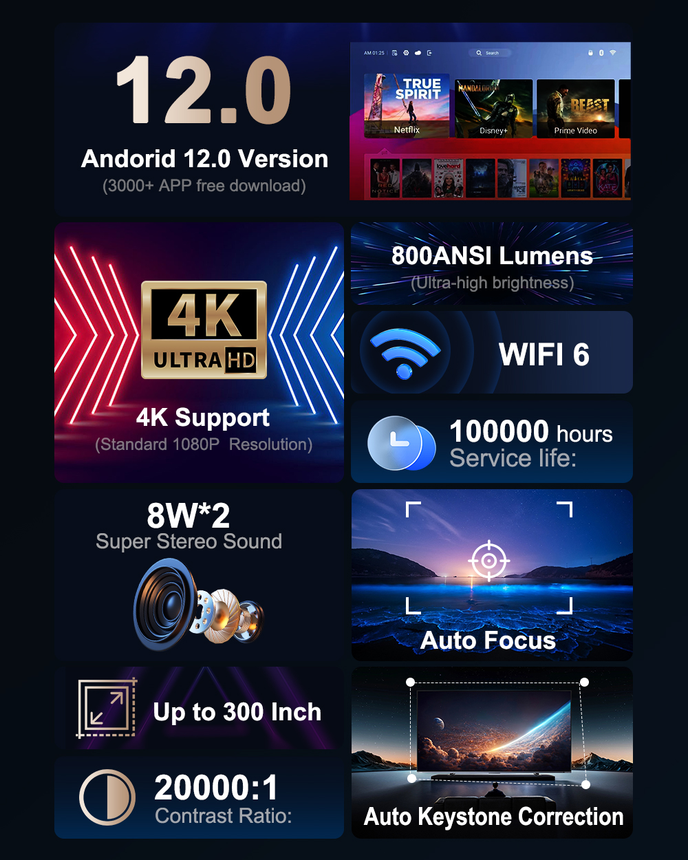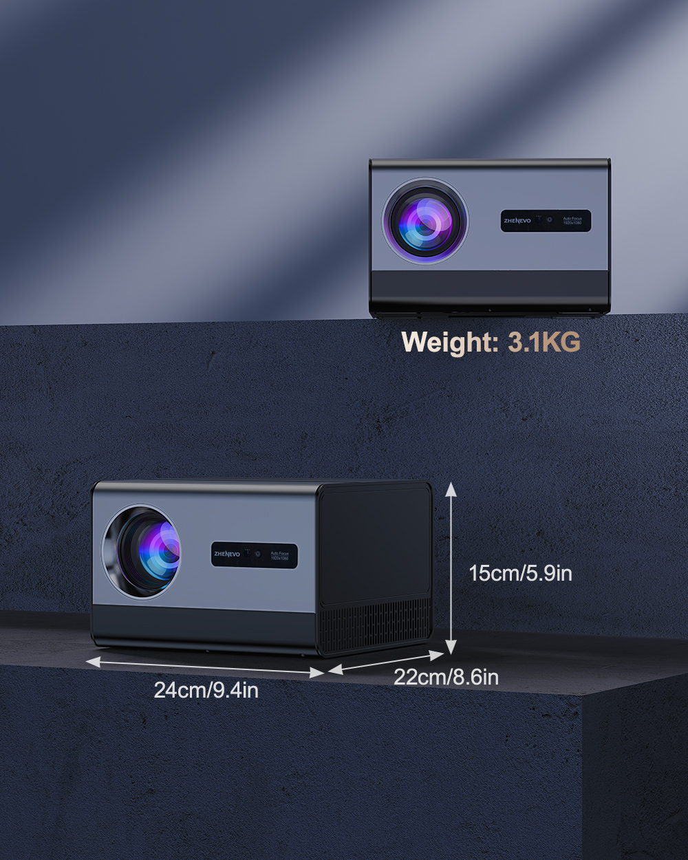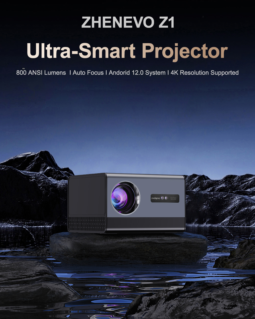 ZHENEVO Z1 on kotikäyttöön sopiva projektori, jossa on Android 12.0 -järjestelmä, 1080P-tarkkuus ja 4K-tuki. 800 ANSI lumenin kirkkaus, automaattitarkennus ja automaattinen trapetsikorjaus helpottavat käyttöönottoa ja parantavat kuvanlaatua. Sisäänrakennetut 8W*2 stereokaiuttimet tarjoavat selkeän äänen, ja WiFi6 mahdollistaa sujuvan langattoman yhteyden.